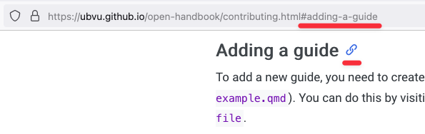 Often, you will want to link to other pages or sections in the Research Support Handbook. Instead of going to the website, and pasting the link from there (for example, https://ubvu.github.io/open-handbook/contributing.html), you can add what is called “relative links.”