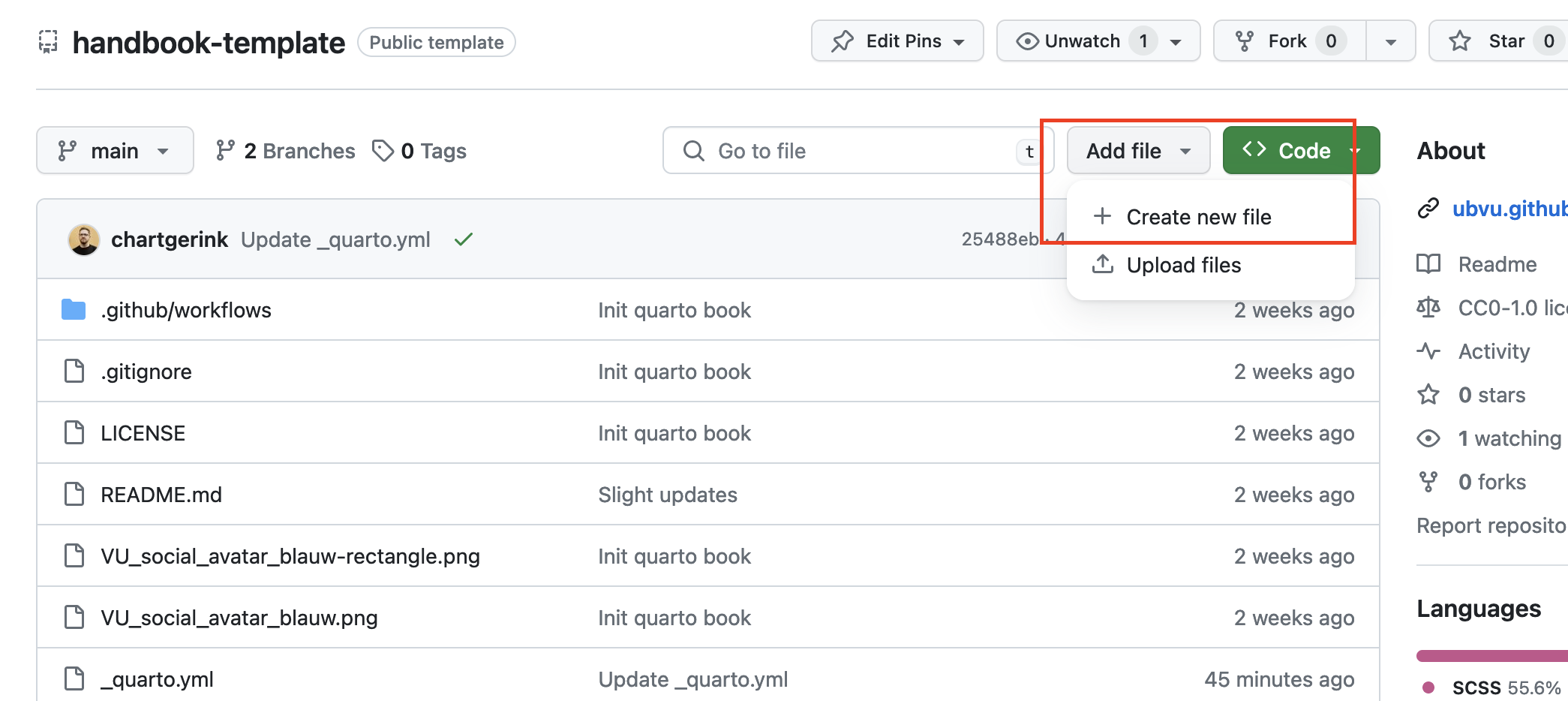 To add a new topic, you need to create a new file ending in .qmd in the topics folder (e.g., topics/example.qmd). You can do this by visiting the handbook page on GitHub and clicking Add file -> New file.