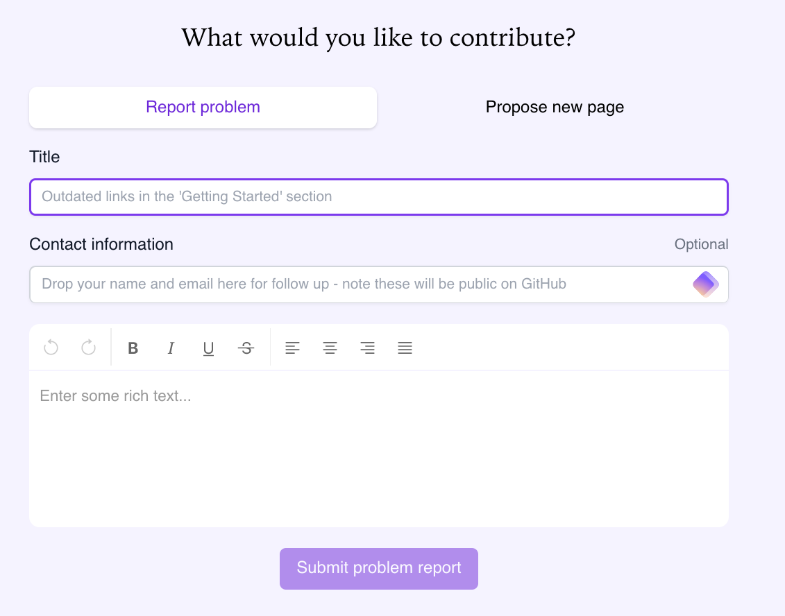 If you want to be credited with contributing, please share your name. If you’d like to hear back about what was done with your feedback or proposal, please also provide a direct way to contact you. Once you have submitted the contribution, the editors will decide how to add your contribution to the handbook. Take a look at the Editor’s guide to learn more about what criteria they consider.