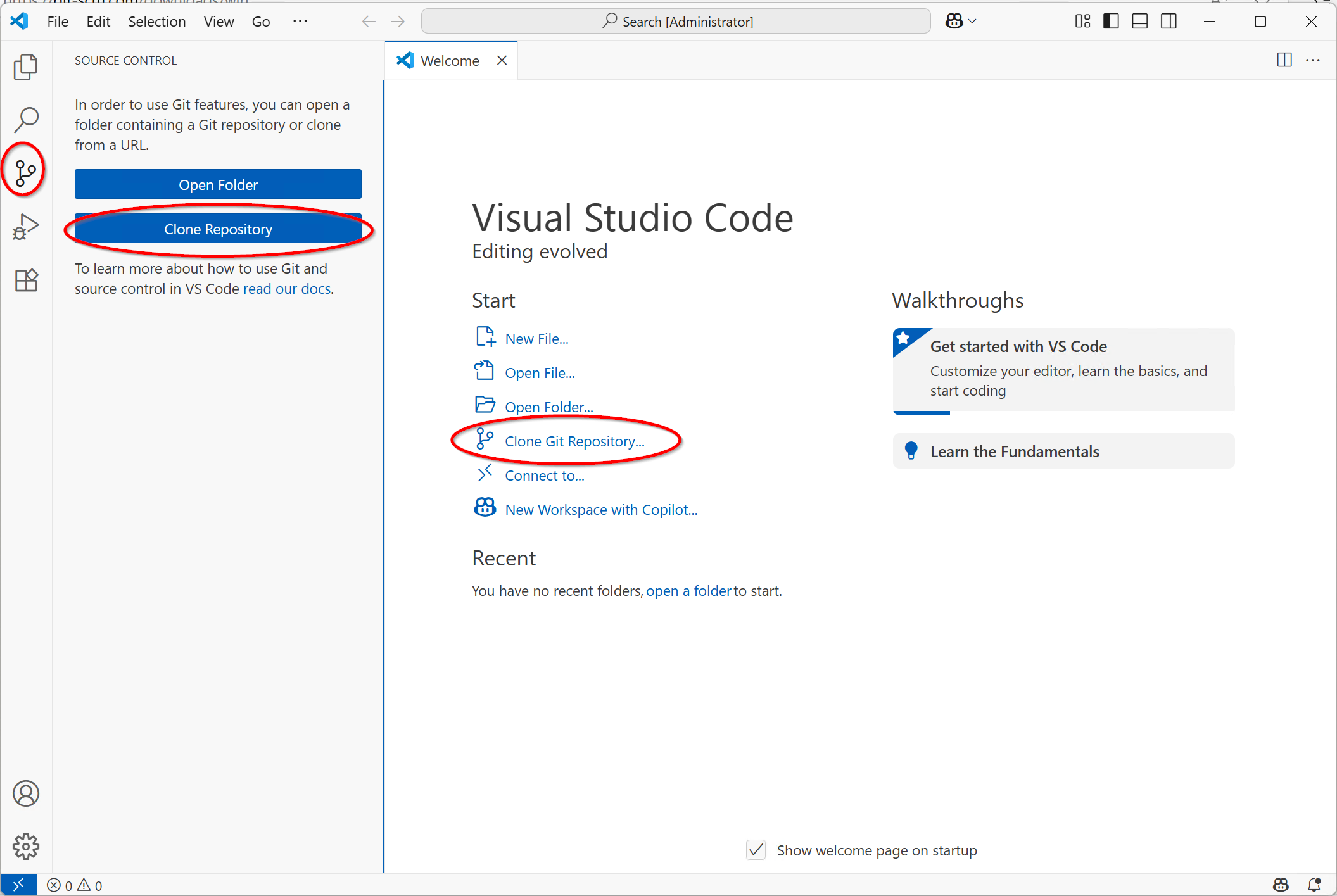 - Open VS Code and click on the Git icon on the left. If you do not have Git installed you can do so from here, the download button will lead you to https://git-scm.com/downloads, you do not need the GUI client.