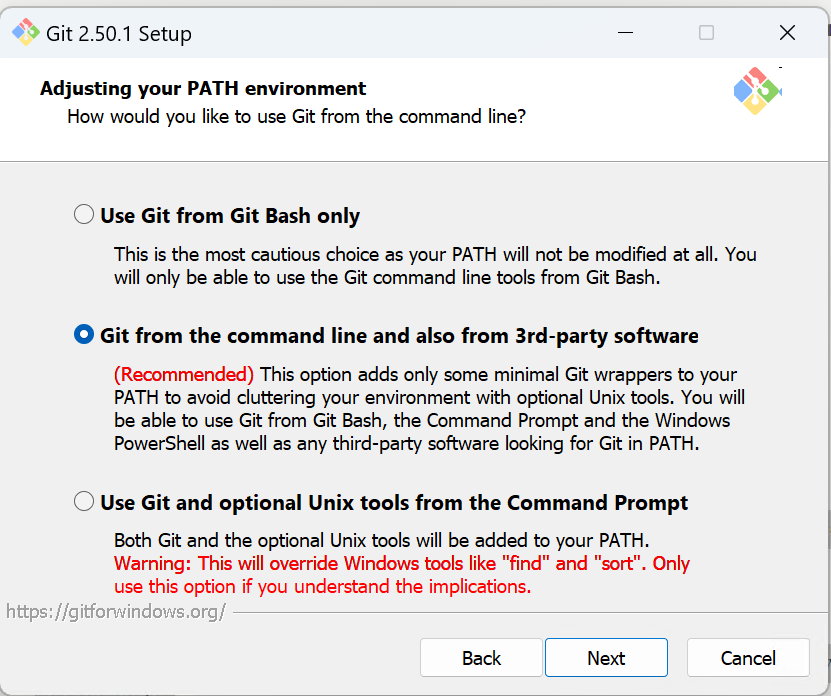 Note that it is not advisable to store code projects in a folder which is synced with OneDrive (such as the “Documents’ folder), OneDrive will have problems syncing the many small files that git uses. The same applies to SURFdrive and Research Drive. You will push changes to your code projects to github so there is no need to make extra backups.
