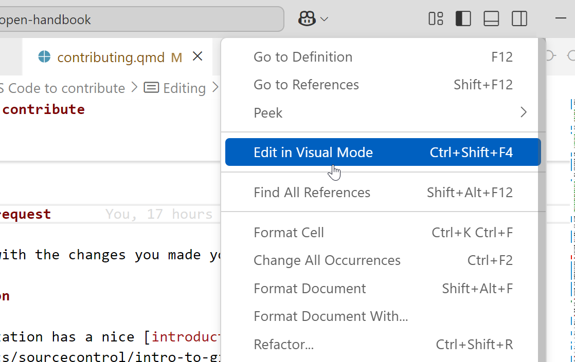 If you are planning to make multiple contributions to the Handbook, working in the GitHub web interface can get cumbersome. In that case we suggest you use an IDE (Integrated Development Environment) to create and edit pages. An IDE is a text editor that has lots of extra functionalities for developers, such as integration with Git. VS Code is a widely used, free, IDE and it is very well suited to edit Markdown files and has integrated Git & GitHub support. This allows you to work on your edits on your laptop whenever you want, preview them using the Quarto client and Push your changes to GitHub. No special knowledge of the Git Commandline is necessary.