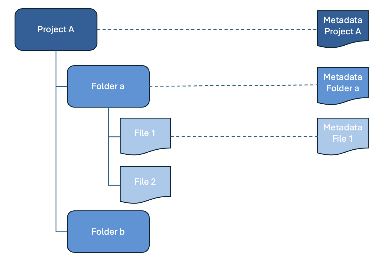 Flowchart indicating a project with a Folder a and Folder b, where Folder a has File 1 and File 2. The project, Folder a, and File 1, have linked metadata to them.